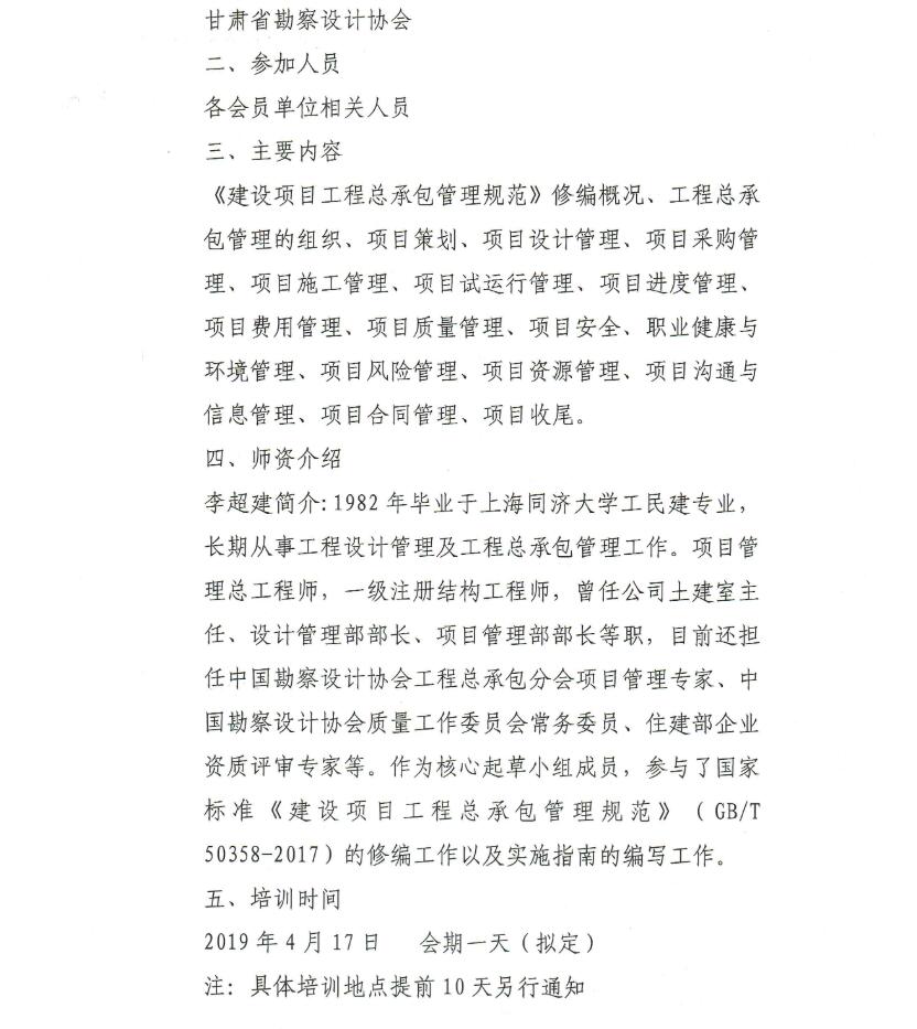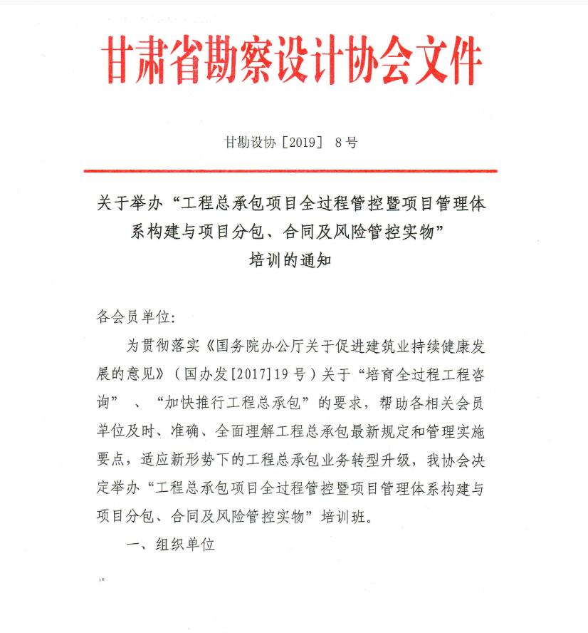 关于举办“工程总承包项目全过程管控暨项目管理体系构建与项目分包、合同及风险管控实物” 培训的通知