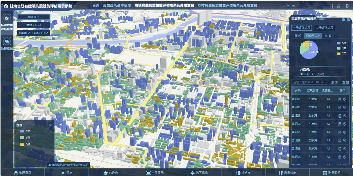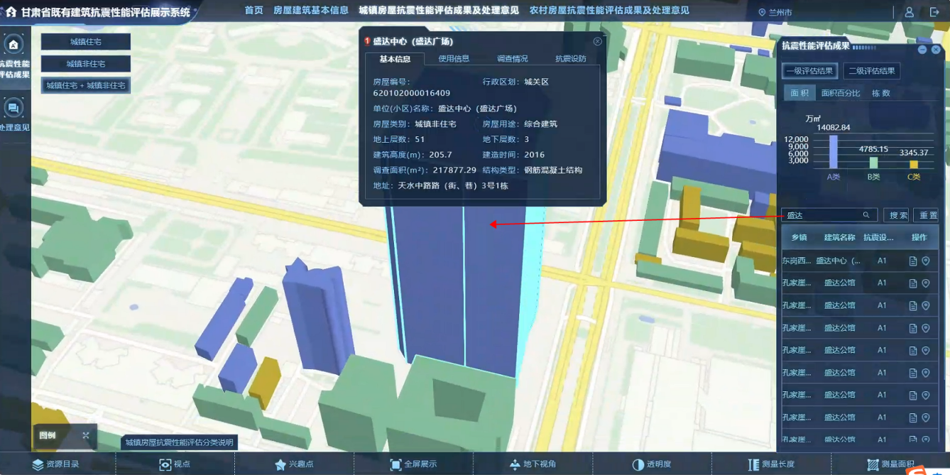三是运用信息化手段,呈现出多维度、多层次的信息关系。为便于评估成果展示、运用,项目组开发了“甘肃省既有房屋建筑抗震性能评估系统”,该“系统”以卫星影像为基石,以信息化为手段,在卫星遥感底图上对房屋逐栋定点定位,使房屋建筑空间位置、属性信息、抗震评估结论相互结合、相互对应,形成了多维度、多层次的信息关系,成果展示立体直观、可视性好,便于查找、可用性强,将成为各级住建部门做好建设工程抗震设防监管等相关工作的有力工具。