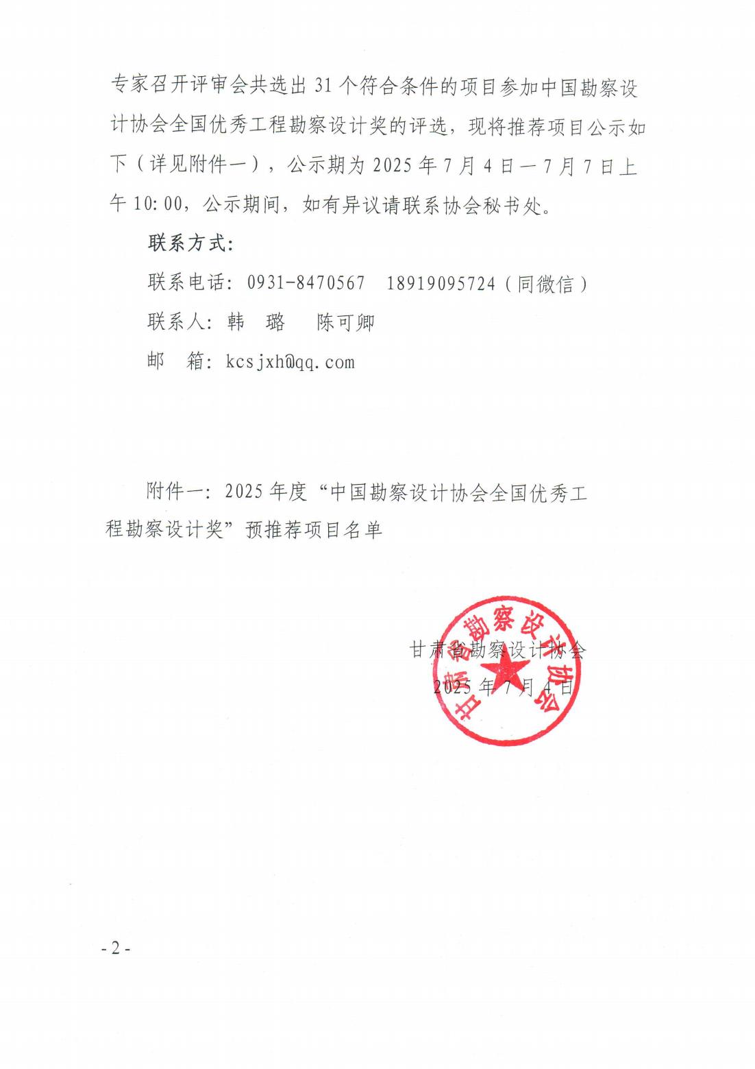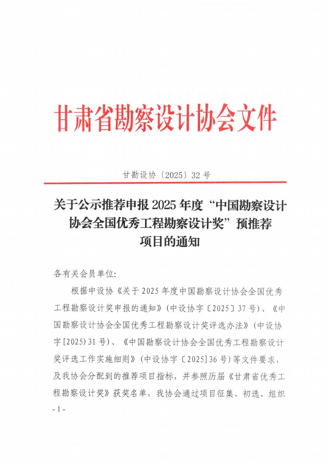 关于公示推荐申报 2025年度“中国勘察设计协会全国优秀工程勘察设计奖”预推荐项目的通知
