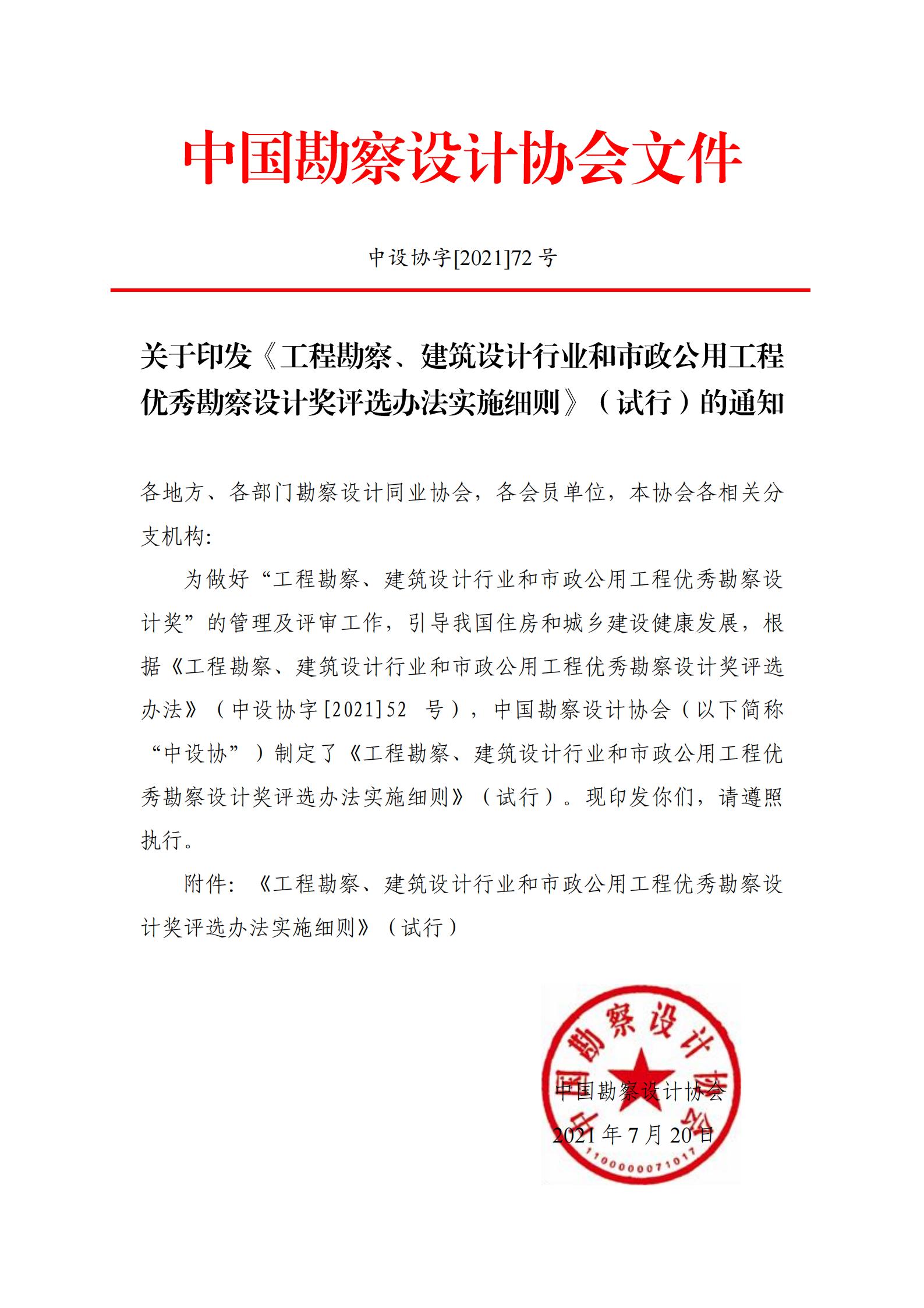 转发中设协[2021]72 号 关于印发《工程勘察、建筑设计行业和市政公用工程优秀勘察设计奖评选办法实施细则》(试行)的通知
