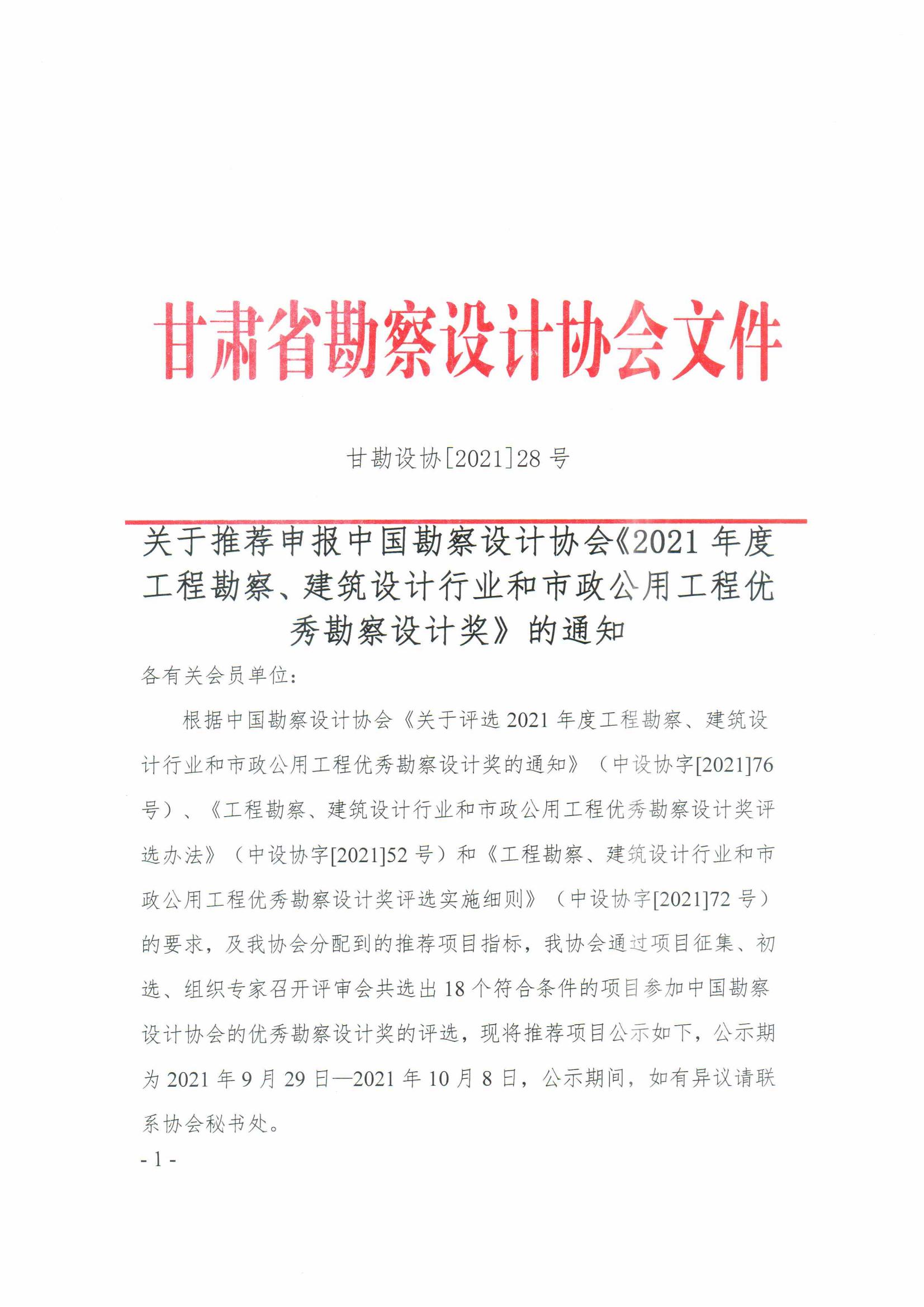 关于公示推荐申报中国勘察设计协会《2021年度 工程勘察、建筑设计行业和市政公用工程优秀勘察设计奖》项目的通知